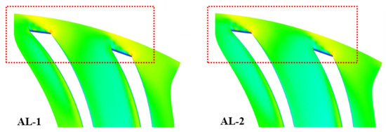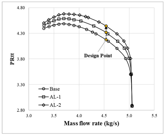 The performance curves of AL-1 and AL-2 are predicted, as shown in Figure 10. After the axial lift was applied, there was no significant change in the choking flow rate because there is no change in the passage area at the impeller inlet. However, the total-to-total pressure ratio increased at all flow rates except the choking flow rate. At the design flow rate, the total-to-total pressure ratio increased by approximately 3% as B2 increased by 1 mm.