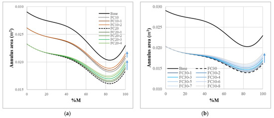 Increased annulus area in the impeller by using the combined flow cut and axial lift method. (a) Base, FC 10, and FC 20; (b) base and FC 30.
