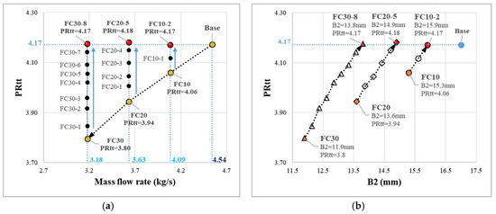 Increased total-to-total pressure at the target flow rate with respect to the combined flow cut and axial lift method. (a) Total-to-total pressure ratio versus mass flow rate (kg/s); (b) total-to-total pressure ratio versus B2.