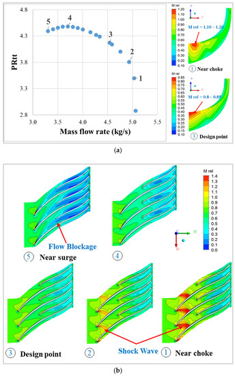 Figure 14 shows the flow fields at five operating points in the performance curve: Near choke, between near choke and design point, design point, between design point and near surge, and near surge. Figure 14a shows the relative Mach number at the 50% blade-to-blade position. The relative Mach number of the impeller inlet tip is approximately 0.8 to 0.85 at the design point and approximately 1.1 to 1.2 near the choke, which means that the base impeller shows the general characteristics of a transonic compressor with a relative Mach number between 0.8 and 1.2 at the impeller inlet tip. In addition, Figure 14b shows the flow fields at 80% span from point 1 to point 5, and it can be seen that the total-to-total pressure ratio decreases sharply when the shock wave occurs between point 1 and point 2. At point 5, a flow blockage occurred on the suction surface of the main blade and on the pressure surface of the splitter blade, and as a result, the total pressure decreases from point 4 to point 5. In this impeller, shock waves are generated only near the choke, not between the design point and near the surge. Therefore, the transonic centrifugal compressor used in this study is a compressor that is very useful for industrial applications if it can be controlled properly within this operating range so that shock waves are not generated.
