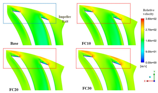 In Figure 17, as axial lift was applied, B2 was increased and relative velocity was decreased. In Figure 18, the relative velocity of FC10, FC20, and FC30 were higher than that of base impeller at the impeller exit, while the relative velocity of FC10-2, FC20-5, and FC30-8 were similar to that of base impeller.