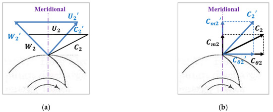 Velocity triangle change of the centrifugal impeller with a backswept angle at the impeller exit. (a) Correlation between the increased relative velocity and the changed absolute velocity angle; (b) correlation between the changed absolute velocity angle and the decreased magnitude of the tangential velocity.