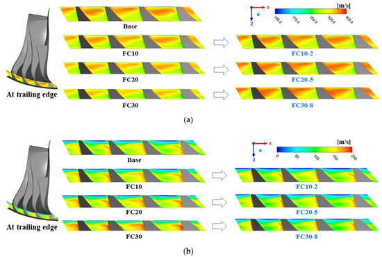 Figure 19b shows the meridional velocity () at the trailing edge of the impeller. The meridional velocity was increased after applying the flow cut because the relative velocity was also increased at the impeller exit. However, when axial lift was used after the flow cut, the meridional velocity was decreased. Therefore, it is confirmed that the flow phenomenon at the impeller exit could be maintained similar to that of the base impeller, when the flow cut and axial lift are applied together.