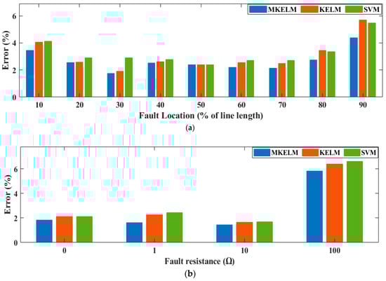 The fault location performance of the proposed method was compared with that of the KELM- and SVM-based methods with regard to the average percentage error at each distribution line in the standard IEC microgrid system, as shown in Table 6. The results indicate that the MKELM had a smaller fault location percentage error than the KELM and SVM.