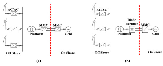 Conceptual design of high voltage direct current transmission systems (HVDC) for an offshore wind farm (OWF): (a) Conventional HVDC; (b) diode rectifier HVDC (DR-HVDC).