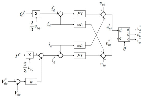 An MMC is a type of voltage sourced converter (VSC), as shown in Figure 2. Using this concept, it is possible to make a huge capacity VSC [11]. In this case, the MMC plays a role as an onshore station of the new OWF by converting DC to AC (Alternative current), Figure 3. To transfer, MMC has three controllers, which are a current, a circulation current, and a capacitor balancing controllers [12,13,14,15,16,17,18,19,20]. Using the Park’s transformation theory to control that, the terminal voltage of MMC in the dq axis can be calculated as