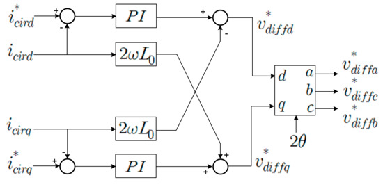 where vdiff is the differential voltage. R0 and L0 are the resistance and inductance of arm inductors, respectively. icir is the circulating current. If the PI controller is adapted to the circulating current controller, as shown in Figure 4, it will be expressed as
