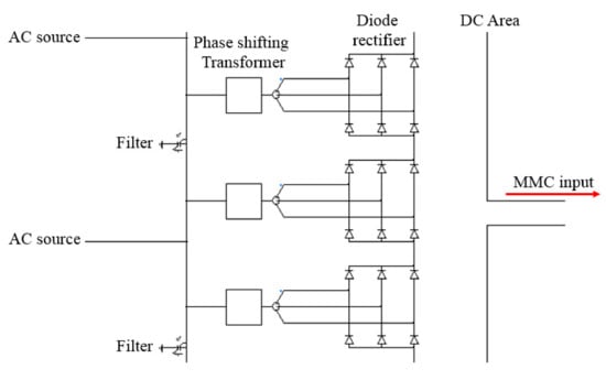 To convert AC power from the wind power generator to DC power, an offshore DR station should be connected to the DC link of the onshore MMC station, as shown in Figure 5. It consists of a DR, AC filter, and phase-shifting transformers. The phase-shifting transformer can reduce the ripple voltage of the DC link. Through a series connection with them, the DC voltage will be increased to rated voltage. The parameters of the DR station are shown in Table 2.