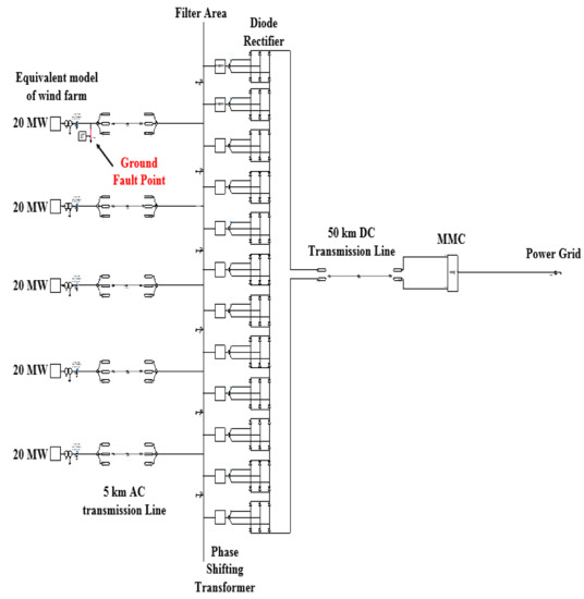 According to advanced research about HVDC with wind farm, voltage sourced HVDC can suitably deliver output power from wind farms to a weak grid such as the Jeju Island power system [2,3,4,5,6,7]. However, its application might increase the installation cost of an OWF. To deal with the economic challenge, [8,9,10] presented a new topology of HVDC, which changes conventional modular multilevel converter (MMC) to the uncontrolled diode rectifier at the offshore platform, as illustrated in Figure 1. Although the controllable converter will disappear in this new grid connection method, the diode rectifier HVDC (DR-HVDC) has many advantages, including reduced installation costs, low losses, easy management, and high reliability, among others.
