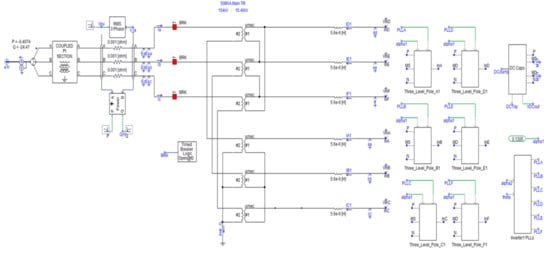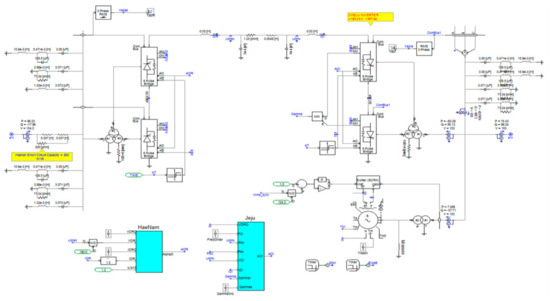 Figure 13 shows the whole simulation model of the Jeju Island power system. The red line represents the connecting point of the new OWF by an electric network interface (ENI), as located in the top left of Figure 13, which supports the parallel computing part in PSCAD/EMTDC. The time scale of the whole simulation is assumed to be 0.14 milli-times by adjusting the time constant of every component. The actual parameters and configurations of the transmission line are applied to this system.