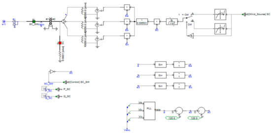 The Jeju Island power system has two STATCOM, each with a capacity of 50 MVar. They have an important role with respect to grid voltage stability in its power system because the CSC-HVDCs consume a lot of reactive power. The simulation models of STATCOM consist of a three-level VSC and its controller, as shown in Figure 11.