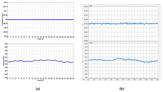 The simulation results of case 1: (a) Measured data in the Jeju Island power system (top: Grid frequency, bottom: Grid voltage measured at the biggest power load); (b) The simulation model (top: Grid frequency, bottom: Grid voltage measured at the biggest power load).