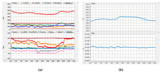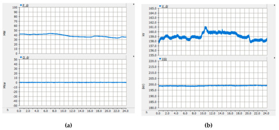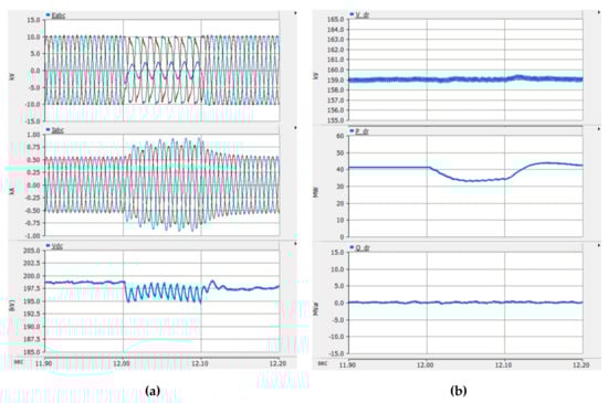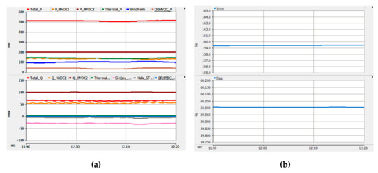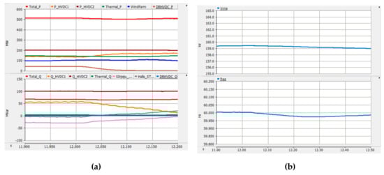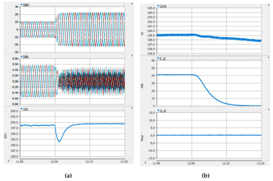 Figure 17a shows simulation results focused on DR-HVDC. Its reactive power was maintained to the unity power factor. The DC link voltage of DR-HVDC was in a constant value of 200 kV regardless of the active and reactive power, as seen in Figure 17b.