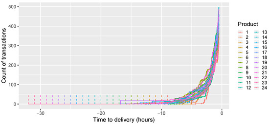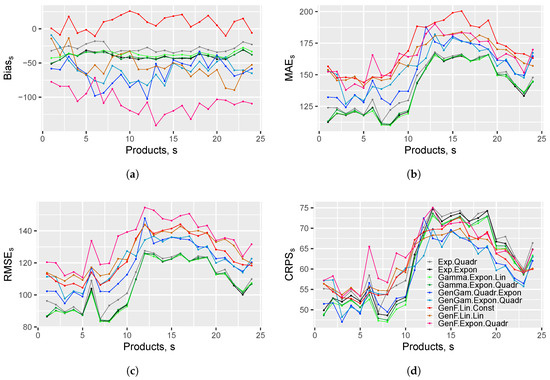 Figure 6 contains four graphs that present the performance of the selected models’ forecasts over products . In Figure 6a, we observe that all the models despite the GenF.Lin.Const underestimate the true trajectory for all products. There is no clear pattern of the underestimation, but we see that the bias of best models in terms of MAE and RMSE is almost constant over products, whereas the bias of the best model in terms of CRPS varies significantly. Figure 6b–d show that all models handle the simulation of night hours’ transactions better than the simulation of the day hours’ transactions. An interesting spike in both measures can be observed for . The reason for that might be some outliers as the spike is higher in terms of RMSE than in terms of MAE or CRPS. Furthermore, we see that the models with exponential and gamma distribution are clearly better than the others across all products in terms of MAE and RMSE. It is different for CRPS, where for most hours the best models are the GenGam models, but between hours 6 and 10 the gamma distributed models appear to be better.
