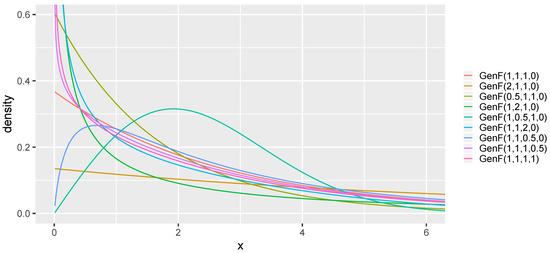 where is the beta function. Let us note that if we possess a random variable , then . We see clearly that all the consecutive distributions are superior to the previous ones. Figure 2 presents densities of exemplary GenF distributions. In the exercise, we use the flexsurv package in R by Jackson [19], which contains the implementation of the generalized gamma and F distributions.