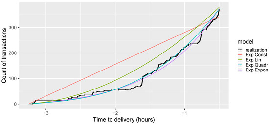 Let us note that the models contain not more than eight parameters, so their estimation should not be a problem. Figure 3 shows an example of fitting the aforementioned models assuming the exponential distribution to one day of data for one product. The figure presents the observed trajectory and estimated cumulative intensity functions . The time to delivery range is , because in this particular exercise we aim to forecast the transaction arrivals during the -Price period. This approach to the German Intraday Continuous was taken also by other researchers ([1,2]). Based on Figure 3, we may expect that considering the exponential distribution models, the models with quadratic and exponential intensity functions have similar performance in our problem.
