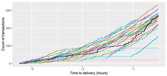 Due to the continuity of the intraday markets, an important aspect is the bidding behaviour of the market participants. This problem has been already examined by, among others, Kiesel and Paraschiv [10] and Aïd et al. [11]. In the following paper, we take a closer look at the transaction arrivals in the intraday electricity market. Figure 1 shows the trajectories of the counting processes that correspond to the transaction time arrivals. In the exercise, we assume that the transactions arrive in accordance with some time-dependent intensity function. Moreover, assuming the parametric probability distribution of the inter-arrival times, we can perform a maximum likelihood estimation of the parameters and then a meaningful forecasting study. In the exercise, we use a rolling window study, following the recommendations of Diebold [12].