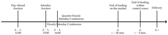 As mentioned, in the exemplary study we consider the German Intraday Continuous market. Trading in this market starts every day at 15:00 for hourly and at 16:00 for quarter-hourly products of the following day. Market participants can trade electricity until 30 min before the delivery in the whole market and until 5 min before the delivery in respective control zones. Figure 5 presents briefly the German electricity spot market, for more details see Viehmann [20].