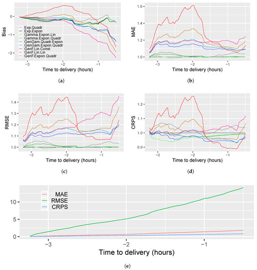 Figure 7 is analogous to Figure 6, but the measures are calculated over the time to delivery. This means that we calculate the values (see Equation (15)) on many short time intervals, i.e., we apply a minute grid of the time-frame . This way we can understand which part of the trajectory is forecasted the most and the least precisely. Figure 7a shows that the most underestimated is the last 1.5 h of the counting process, but the models with gamma and exponential distribution handle this period better than the GenGam and GenF models. Figure 7b,c show again the Gamma and Exp models with exponential rate function give mostly the lowest MAE and RMSE. In Figure 7d, we see that Gamma.Expon.Lin model has lowest CRPS in the first half of the forecasting horizon and, surprisingly, in the second half the lowest CRPS value is obtained for model GenF.Lin.Const. The performance of GenGam.Quadr.Expon is mostly stable over the time to delivery.
