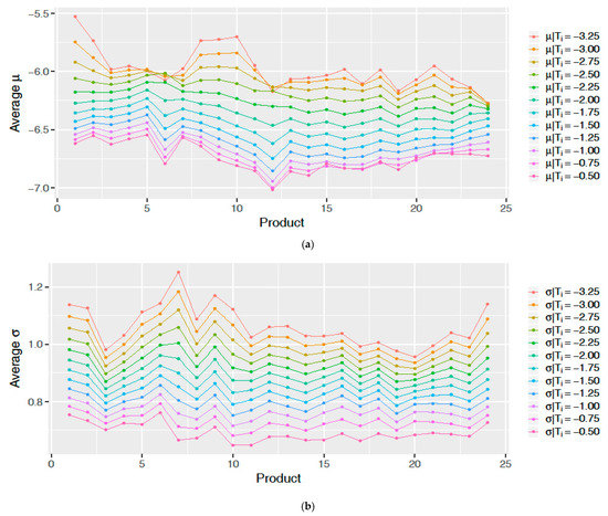 Let us now take a look at the values of the time-varying coefficients of the model GenGam.Quadr.Expon. Let us recall that in this model we estimate the inter-arrival time assuming generalized gamma distribution with the time-varying coefficients and and constant Q, where and are the rate and shape parameters of the standard gamma distribution. In this model is a quadratic function and is an exponential function. In Figure 10, we analyse the behaviour of and parameters over products at different time. Figure 10a shows the values of are similar over products, but differ significantly over time. That is to say, the closer we are to the gate closure, the lower the location coefficient, which means that the transactions appear more often. Figure 10b shows a very similar behaviour for the scale parameter . In this case the closer we are to the gate closure, the less vary the inter-arrival times.