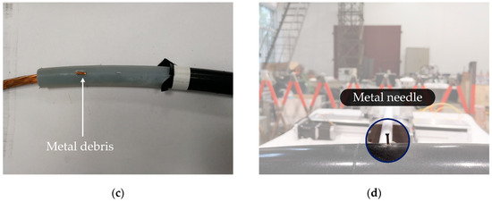 - The electric field distortion magnitudes were 9.3%, 11.8%, 26.2%, and 29.7% for the defects of air void, water film, metal debris, and metal needle, respectively. The air and water defects of large size caused less field distortion when compared with metal defects of small size. Therefore, air void and water film defects were difficult to detect when they were smaller than 5 mm3 because their field distortions were relatively small and might be concealed by interference.