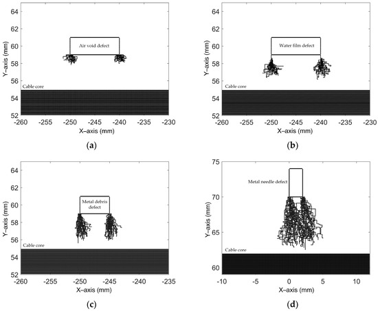 - The average length of the electrical tree trajectories around a water film defect was larger than those around an air void defect due to the opposite field distortion tendencies around the defect. The electrical trees around metal debris and needles were more inclined to approach the cable core and cause main insulation breakdown compared with other types of defects.