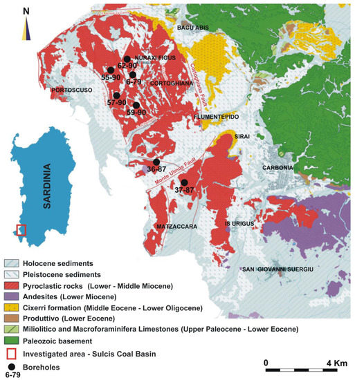 The Sulcis Coal Basin (Figure 1) is located in the south-western sector of Sardinia (Italy). The Sulcis Coal Basin represents one of the most important Italian coal reserves characterized by great mining potential. The stratigraphic succession of the basin is characterized by rocks dating back to the Paleozoic up to the Quaternary (Figure 1).
