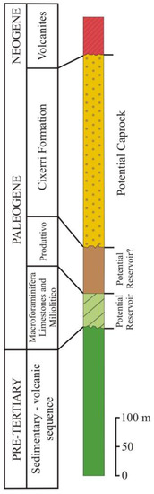Typical stratigraphic sequence of the Sulcis Coal Basin: Sedimentary, volcanic sequence (Permian–Triassic); Macroforaminifera limestones and Miliolitico Auct. (Upper Paleocene–Early Eocene); Produttivo Auct. (Early Eocene); Cixerri Formation (Middle Eocene–Lower Oligocene); Volcanites (Early Miocene–Middle Miocene) [13].