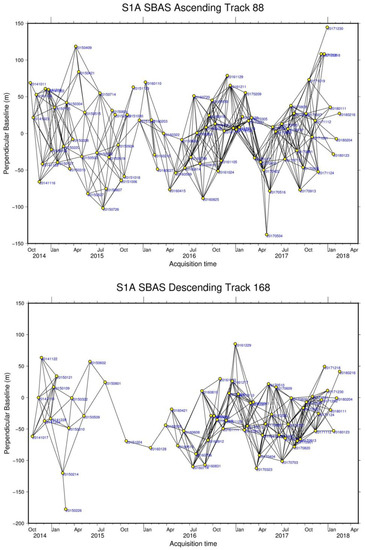 The time trend of the vertical displacement was computed using the full-resolution interferograms with the technique SBAS (small baseline subset) by differencing the interferograms derived with the application of the above-described A-DinSAR methodology and taking into account only the baselines less than 100 m and 60 days using the data base of all available baselines [31,37].