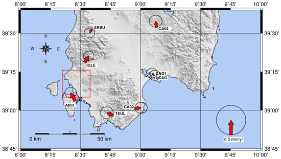 Horizontal residual Eurasian intra-plate velocities of the permanent GNSS station computed in this work for the area of south Sardinia (Cagliari district). The velocity values are expressed in mm/year and are represented as red arrows together with the corresponding error ellipses in black. The velocity values range in the interval ±0.3 mm/year (see reference velocity of 0.5 mm/year in the lower right corner of the Figure). The study area is represented by a red rectangle.