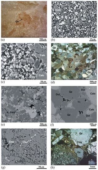 Textural and compositional characteristics of the Cixerri Fm. samples: (a) Oxidation (Ox) in a siltstone, Optical Microscopy (OM) in plane polarized light; (b) Compositional features of a siltstone: calcite (Calc), clay minerals (Clay), and ankerite (Ank), SEM image; (c) Clay matrix (Clay) and calcite (Calc) in a wacke, SEM image; (d) Texture and composition of a litharenite, characterized mainly by lithic elements (Lit) and quartz (Qz), OM in cross-polarized light; (e) Altered potassic feldspar (K-Feld) in a subarkose, SEM image; (f) Quartz granules (Qz) in a sandstone cemented by calcite (Calc) and dolomite (Dol), SEM image; (g) Clay minerals (Clay) inside the intergranular spaces and within the fractures (F) in a sandstone, SEM image; (h) Conglomerate characterized by lithic elements (Lit) and quartz granules (Qz) bonded by a clay matrix (Clay), OM in cross polarized light.