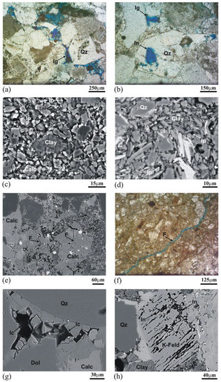 Porosity of the Cixerri Fm. samples: (a) Intergranular porosity (Ig) among the granules of quartz (Qz) in a sandstone, OM in plane polarized light, thin section treated with blue dye epoxy resin; (b) Intergranular porosity (Ig) among the granules and intragranular porosity (In) within a granule of quartz (Qz) in a sandstone, OM in plane polarized light, thin section treated with blue dye epoxy resin; (c) Interparticle porosity (Ip) among the particles of calcite (Calc) and clay minerals (Clay) in a siltstone, SEM image; (d) Interparticle porosity (Ip) within the clay matrix in a conglomerate, Qz (quartz) SEM image; (e) Fracture porosity (F) in the calcite cement (Calc) of a sandstone, SEM image; (f) Fracture porosity (F) in a siltstone, OM in plane polarized light, thin section treated with blue dye epoxy resin; (g) Intercrystal porosity (Ic) between the dolomite (Dol) and calcite (Calc) crystals that make up the cement of a sandstone, SEM image; (h) Intracrystal porosity (In) within a crystal of K-feldspar (K-Feld) in a subarkose, Qz (quartz), Clay (clay minerals), SEM image.