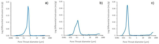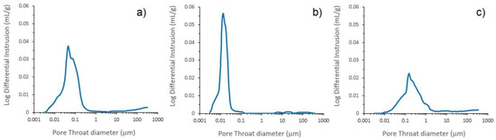 The curves obtained from MIP analyses, plotted as a logarithm (log) of the differential intrusion volume of mercury versus pore-throat diameter, are shown in Figure 8. This representation highlights the pore-throat size distribution in the analyzed samples.