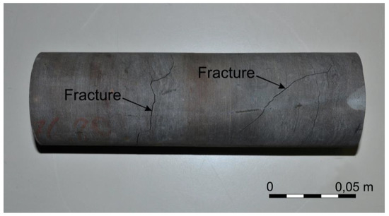 The lithologies with the higher velocity, in the range 4860–5162 m/s (Table 2) in dry conditions, are the sandstones classified as litharenites according to Pettijohn et al. (1987) [66]. The high longitudinal velocities are a consequence of the presence of carbonate cement between their grains. Cementation enhances the contact between the rock components, decreasing the porosity and facilitating longitudinal wave propagation. In these rocks, the longitudinal velocity generally increases from the dry to the water-saturated conditions. Only in one sample (C9-borehole 57–90) is a decrease in saturated longitudinal velocity the consequence of the presence of pelitic levels interbedded with well cemented arenaceous levels, as can be seen from SEM analyses. During the saturation process, water causes clay hydration and swelling, with a consequent volume expansion and the formation of new fractures (Figure 9) causing the elastic properties to worsen.
