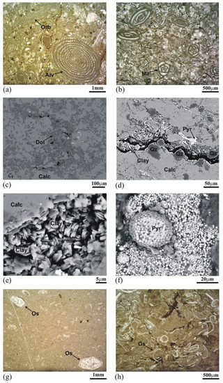 The sandstones have a grain-supported texture and are generally made up of sub-rounded grains of carbonate lithic elements and quartz (Figure 6d). Due to the above textural characteristics, these rocks can be classified as litharenites [66]. The grains range from 200 to 500 μm (fine sand to medium sand). A sample of sandstone (C2-borehole 37–87) contains about 10% of K-feldspar (Figure 6e) and can be classified as subarkose [66].