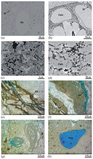 The intercrystal porosity can be observed in some samples of sandstones (samples C1-borehole 55–90 and C1-borehole 62–90), within the carbonate cement, just among the crystals of calcite and dolomite (Figure 7g). The sizes of these pores range between 3 μm and 50 μm.