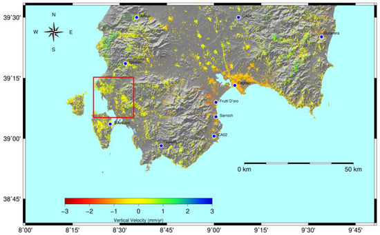In this work, to account for the stability of the investigated area, in particular the ground vertical and horizontal component of displacement and deformation, a geodetic study was carried out integrating GNSS and A-DinSAR technologies [31,37,38,39]. Although the broad kinematics of Sardinia and South-Sardinia is mainly known (see, for example, Devoti et al., 2017 [40]), the present work has provided available data for a better understanding of the details of how tectonic motions are accommodated on more regional and local spatial scales and on monthly and daily temporal scales.