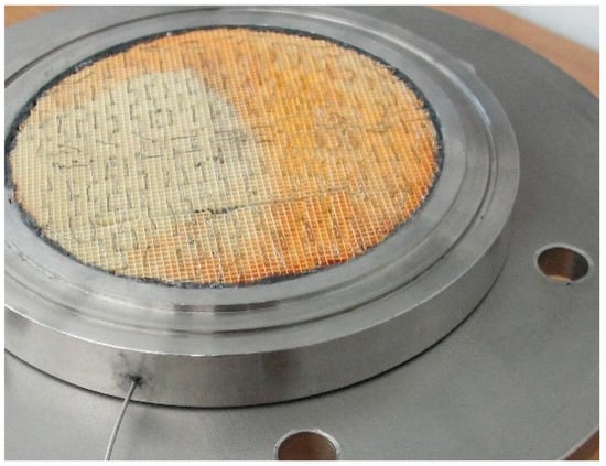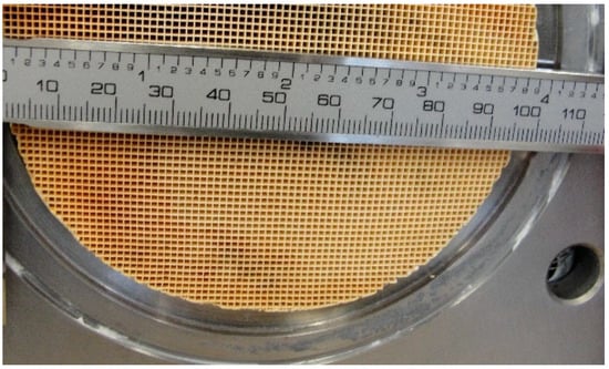 The stack holder accommodates a ceramic honeycomb stack with a low thermal conductivity and a high specific heat, as required to improve the heat to acoustic power energy conversion efficiency []. This stack is characterized by a cell density near 400 cells per square inch (cpsi) and has pores of squared shape with a hydraulic radius of around 0.28 mm. A picture of the stack is shown in Figure 2.