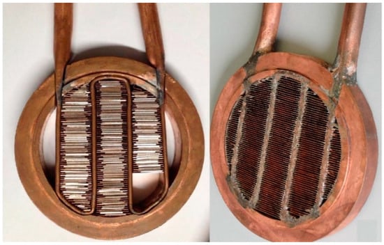 The finned-tube heat exchanger during the fabrication phase (on the left) and after the fin brazing.