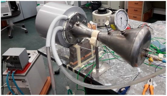 A picture of the standing wave engine in place for testing is shown in Figure 5. On the left, the cylindrical thermally insulating cap filled with rock wool used to minimize thermal leakage from the hot segments of the engine (“hot duct, electric heater, and stack holder) to the environment is visible.