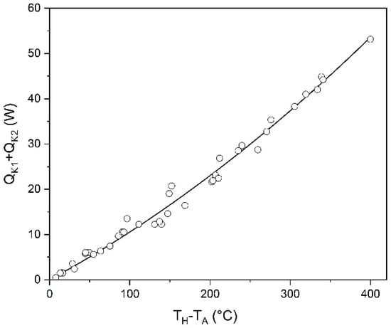 With this aim, the heat flux (QK1 + QK2) was experimentally determined once for all by powering the heater below the onset temperature of the engine and measuring the thermal load on the AHX. Results are shown in Figure 6 where (QK1 + QK2) is plotted against the temperature difference between the heater, TH, and the ambient heat exchanger, TA = (Ts + Tg)/2. As for the QK3 contribution, it was estimated by simulating the energy fluxes in the engine by the DeltaEC code where the experimental values recorded by the dynamic pressure sensors P1, P2, and P3 were used as inputs for model refinements. By this procedure, the Q values resulted about 25% lower than the measured QA values.
