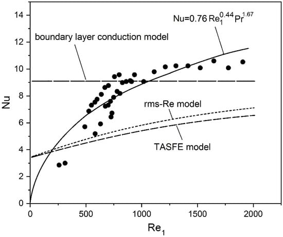 The TASFE and rms-Re models are able to predict the increase of Nu with Re1 but, analogously to the previous model, overestimate the experimental data at low Reynolds numbers (Re < 300) and underestimates them at high Reynolds numbers (Re > 300). Furthermore, the Nu number provided by the rms-Re results slightly higher than that provided by the TASFE model.