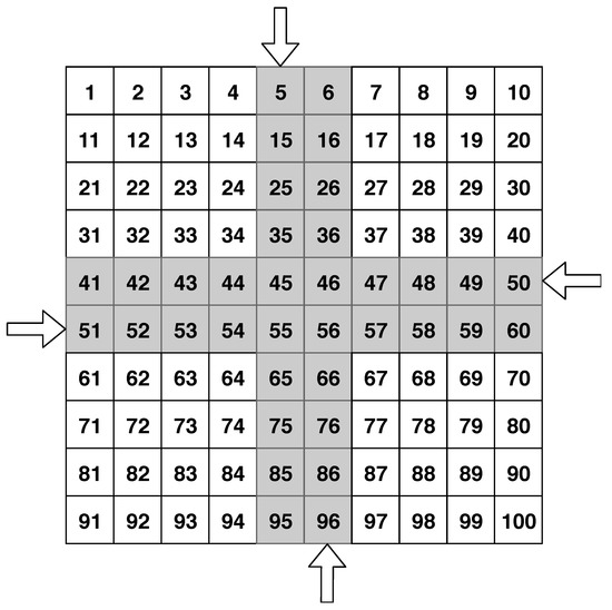 The testing ground includes the following set of parameters: , where c is the number of columns that define the field; r is the row amount defining the field; is the set of roads where the AV can move. In its turn, each road is characterized by a set of parameters , where t is the road type (vertical or horizontal); d is the road direction (passing or oncoming); and E is the set of elementary sectors defining the roadway. The model of AV (MAV) consists of the following characteristics: