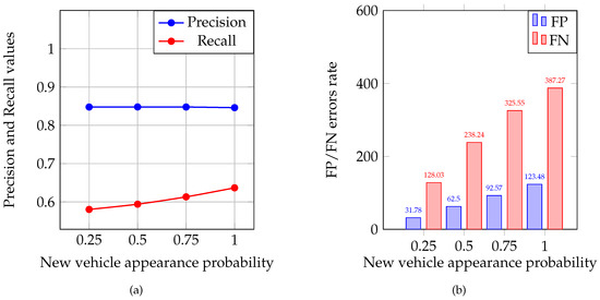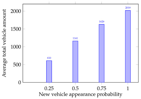 The main purpose of the simulations conducted was to show the method proposed can detect saboteurs in the group of MAVs. This is vital in the context of providing a sufficient safety level in the intersection management system. The average and values were calculated for each of the experiment groups and are presented in Figure 2a. The distribution of average FP and FN is illustrated in Figure 2b. To assess the FP and FN error rates, two relations were calculated: percentage of FP from the total number of legitimate MAVs and percentage of FN from saboteur number. These relations are presented in Figure 3a,b as percentages, respectively. From these relations, one can see that the more the load on the intersection increases, the more strictly the system begins to respond to incorrect data sent by MAVs. The average total number of vehicles that participated in each experiment group is presented in Figure 4.