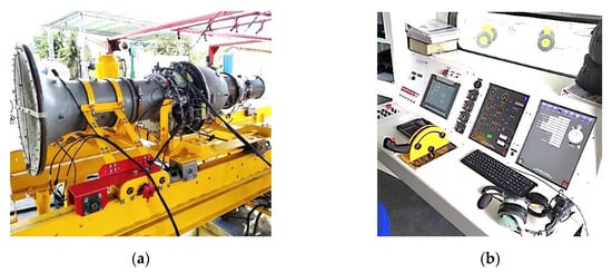 (a) General aspect of the J69 engine installed in the testing bench; (b) detail of the control booth used in the experimentation.