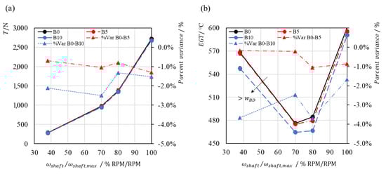 Effect of the biodiesel content for experiments B0, B5, and B10 varying the engine regime () in the: (a) thrust force () and the absolute percent variance, (b) exhaust gas temperature (EGT) and the absolute percent variance.