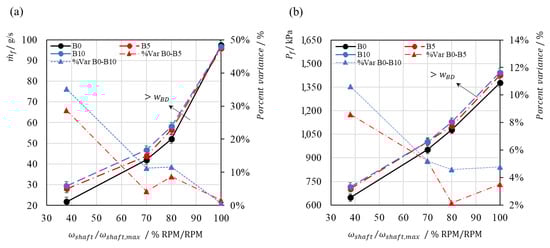 Effect of the biodiesel content for experiments B0, B5, and B10 varying the engine regime () in the: (a) fuel consumption () and the absolute percent variance, (b) fuel injection pressure () and the absolute percent variance.