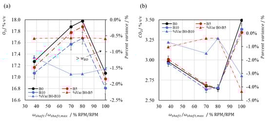 Effect of the biodiesel content for experiments B0, B5, and B10 varying the engine regime () in the: (a) content of oxygen in flue gas () and the absolute percent variance, (b) content of carbon dioxide in flue gas () and the absolute percent variance.