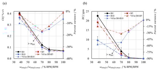 A reduction of the CO and HC emissions is also presented in Figure 6 with the rise of biodiesel content up to 10% v/v, with a maximum variation between 70% RPM and the cruise regime (80% RPM). The reduction of the HC emissions when using 10% v/v near 58% indicates a higher combustion efficiency and a more complete combustion within the engine. Kimble et al. [] and Chiaramoniti et al. [] also reported a reduction in the evolved CO when increasing the atomizing pressure from 0.3 bar to 1.1 bar, leading to a better flame stability within the combustion chamber and raising the fuel injection temperature above 120 °C, as the fuel viscosity is reduced when increasing the injection temperature and thus, improves the atomization and volatilization processes.