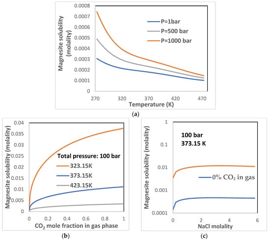 MgCO3 mineral solubilities (i.e., lansfordite, magnesite, and nesquehonite) at various temperatures, pressures, and NaCl molalities are calculated by this model. Figure 6a shows the solubility of magnesite at temperature ranging between 0 and 200 °C, and pressure ranging between 1 and 1000 bar. Magnesite solubility decreases with temperature and increases with pressure. Figure 6b shows the magnesite solubility with CO2 mole fraction at various temperatures and 100 bar. From the results, the presence of CO2 in gas phase significantly enhances magnesite solubility in water. Figure 6c shows the magnesite solubility varying with NaCl molalities at 100 bar and various temperatures under conditions of gas free or 100% CO2. The NaCl molality can enhance the dissolution of magnesite. With same temperature, pressure, and NaCl molality, when the solution is in equilibrium with CO2, the magnesite solubility increase is significant.